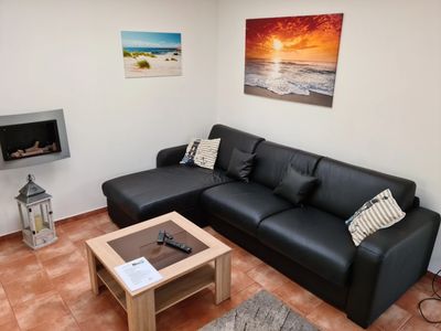 Es gibt eine neue schwarze Eckcouch die optimal in Richtung Fernseher ausgerichtet ist. Der Fernseher hat Satelliten Empfang und ein Flachbild. In dem Ferienhaus unter dem Fernseher findet Ihr auch eine Spielebox mit Brettspielen, auch auf der Insel Rügen an der Ostsee gibt es mal schlechtes Wetter aber eher selten. Eine Stereoanlage sorgt für Musikalische Unterhaltung. Der Ethanol Kamin darf verwendet werden aber beachten Sie die Sicherheit. Der Feuerlöscher steht neben der Eingangstür. Ethanol bekommen Sie beim Verwalter oder normal im Handel.